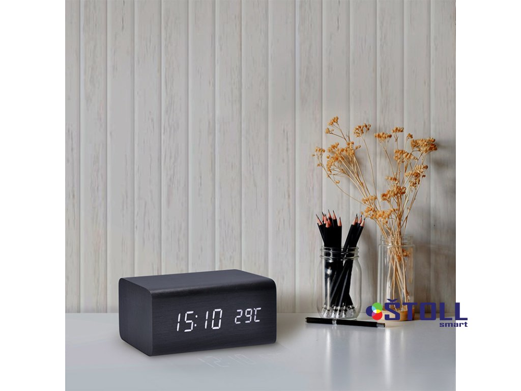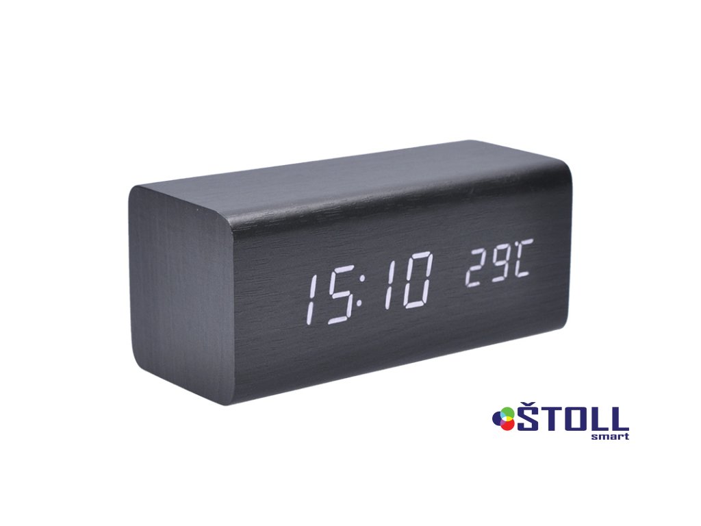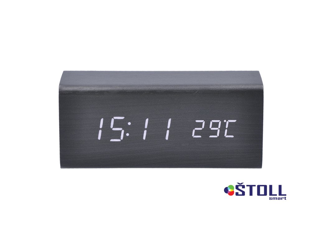 Elegantní LED budík v dekoru černého dřeva nabízí moderní funkce včetně režimu spánku displeje, probuzení tlesknutím a nastavitelné intenzity podsvícení. Zobrazuje čas (12/24h), datum, rok a vnitřní teplotu. Možnost nastavení tří budíků a výběru různých režimů zobrazení. Zabudovaná baterie uchová nastavené hodnoty. Napájení USB kabelem (součástí balení) nebo 3× AAA bateriemi (nejsou součástí).