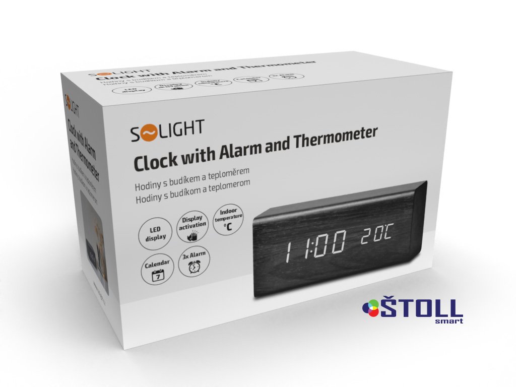 Solight hodiny s budíkem, bílé LED podsvícení, tři budíky, nastavitelná intenzita podsvícení, teploměr, dekor: černé dřevo