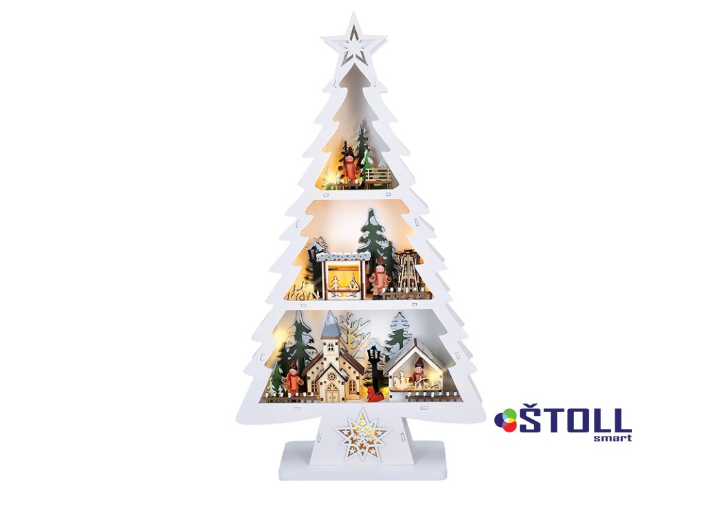 LED dřevěný vánoční stromek s dekoracemi, 13x LED, bílá, 53cm, 2x AA