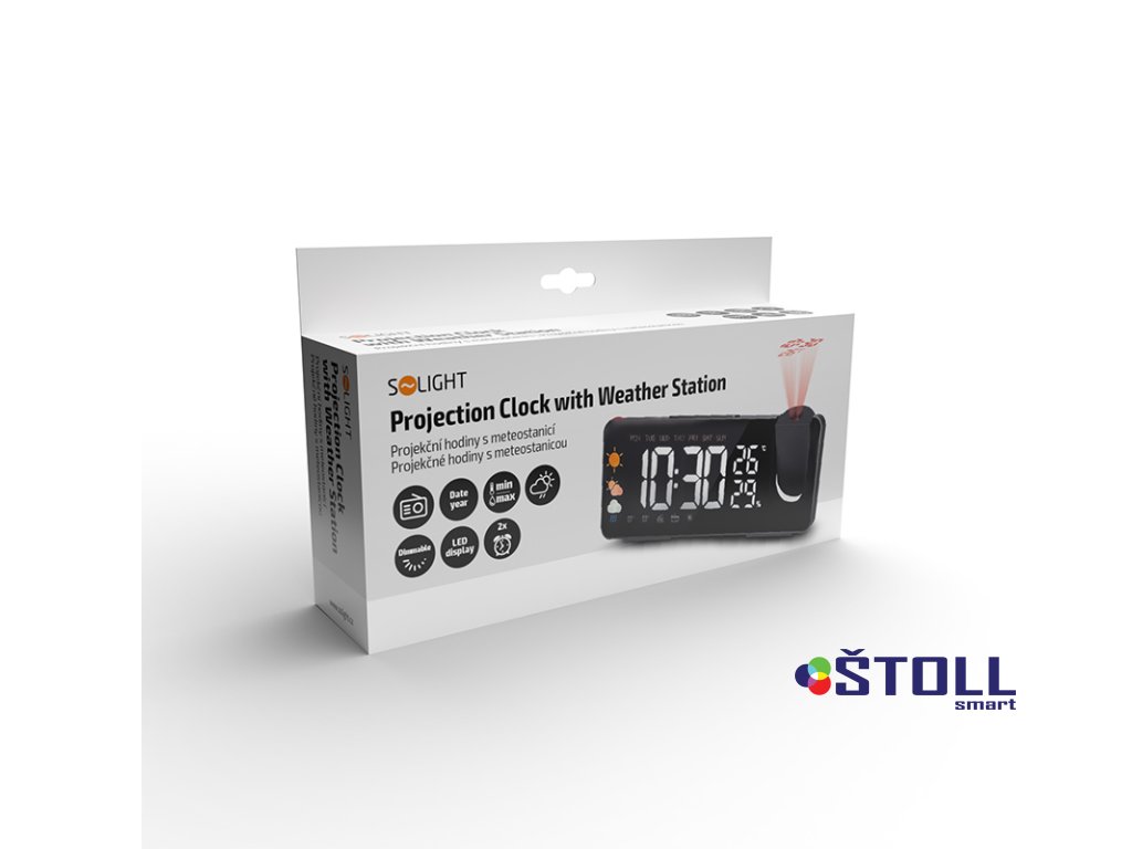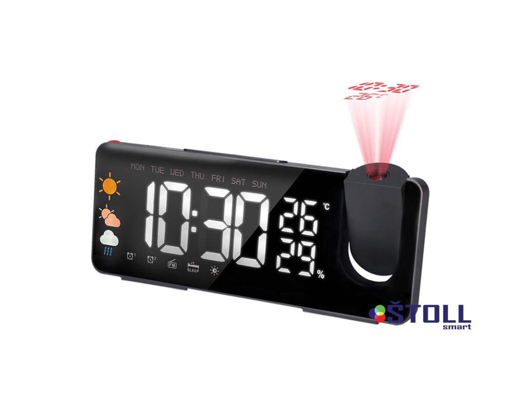 Tento moderní budík kombinuje projekci času a teploty, FM rádio (87,5–108 MHz) a předpověď počasí. Má duální budíky s možností nastavení pro všední dny, víkend nebo denní buzení a tón budíku lze nastavit jako rádio. LED displej s nastavitelným jasem a možností otočení projekce o 180° pro pohodlné zobrazení. Měří teplotu (-9°C až +50°C) a vlhkost (20–95%).