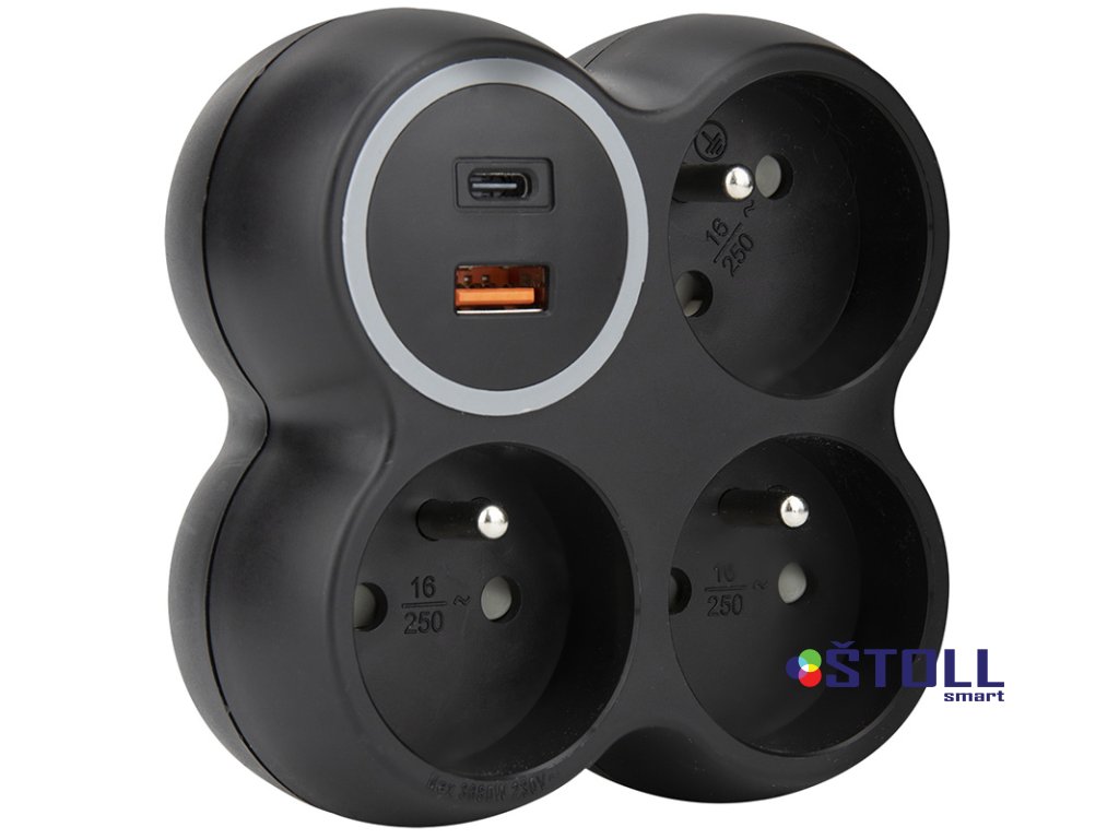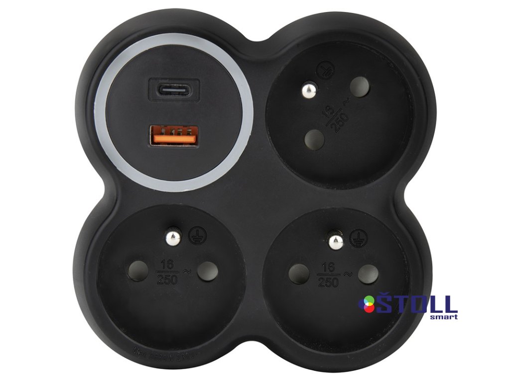 Solight rozbočka, 3x 15A, USB A+C rychlonabíječka 20W PD, matná černá