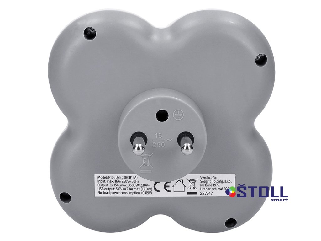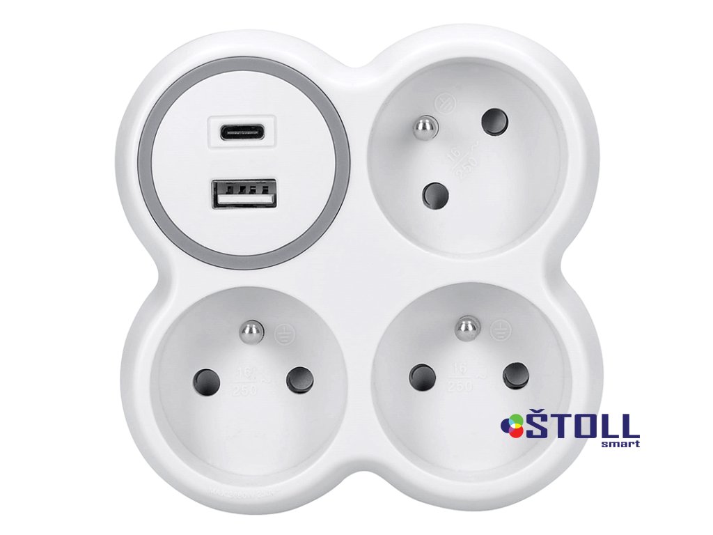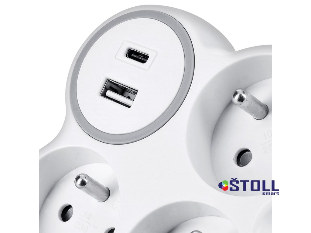 Solight rozbočka, 3x 15A, USB nabíječka A+C, bílá-šedá
