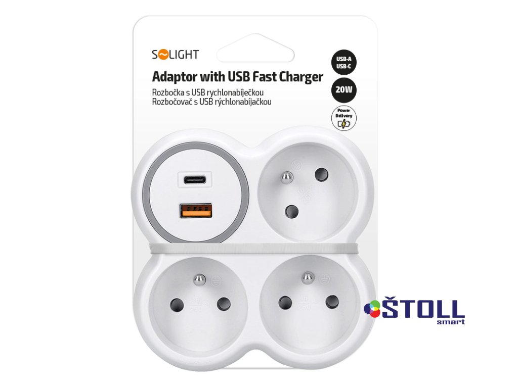 Solight rozbočka, 3x 16A, USB A+C rychlonabíječka 20W PD, bílá-šedá