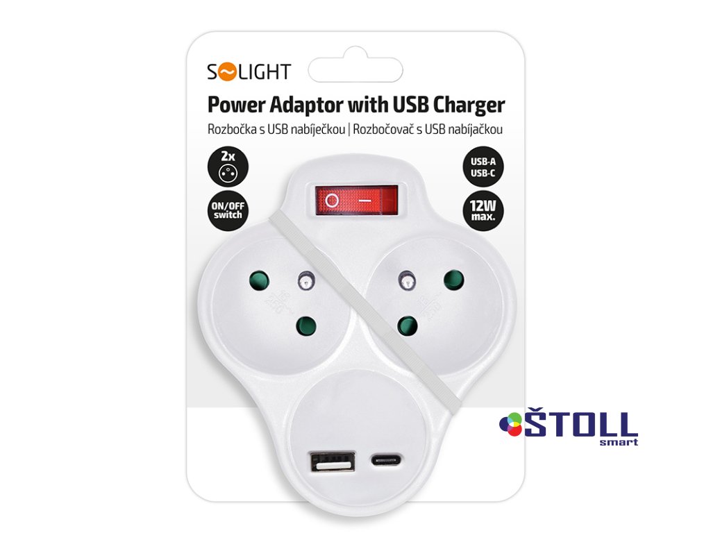 Solight rozbočka s USB A+C nabíječkou, 2 x 10A, bílá, vypínač