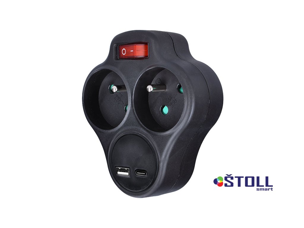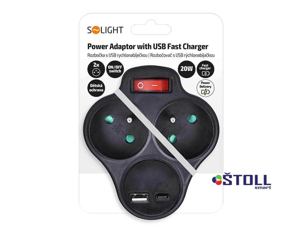Solight rozbočka s USB A+C rychlonabíječkou 20W PD, 2 x 10A, černá, vypínač