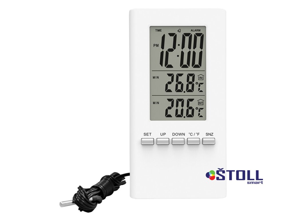 Teploměr s měřením vnitřní i venkovní teploty. Vnitřní rozsah: -10°C až +50°C, venkovní rozsah: -40°C až +70°C. Paměť minimálních a maximálních teplot pro sledování teplotních změn. Funkce času a budíku pro pohodlné použití. Délka kabelu se senzorem 1,5 m. Bílá barva, napájení 1x LR54 (AG10) baterie (součástí balení). Ideální pro domácnosti a venkovní použití.