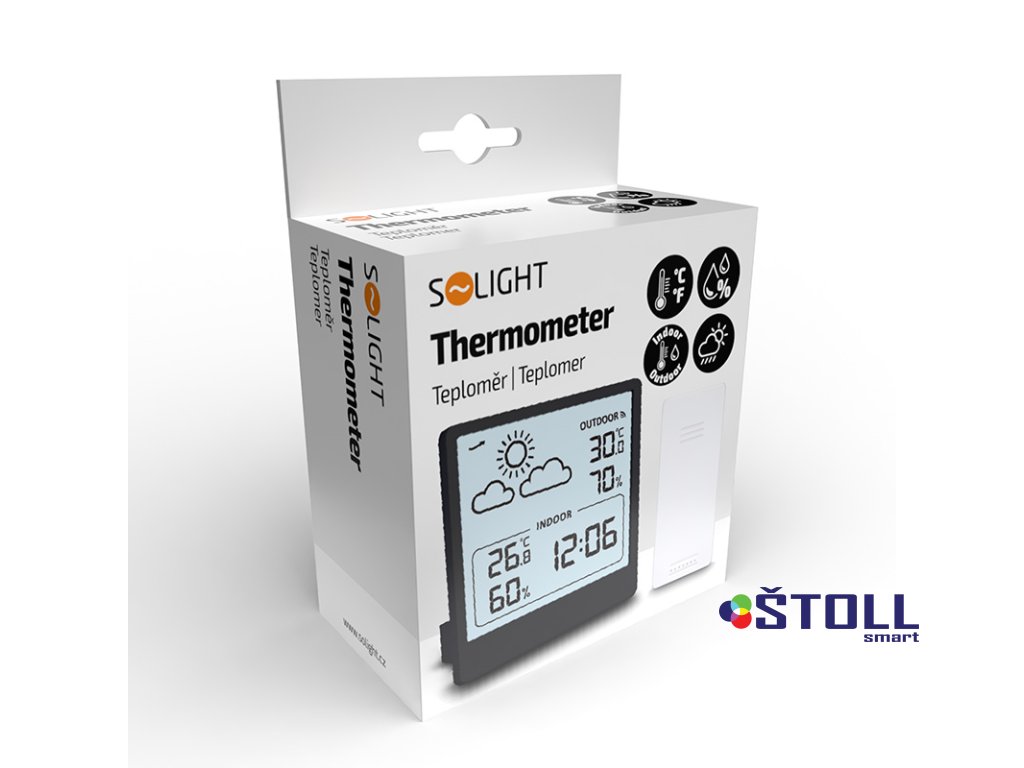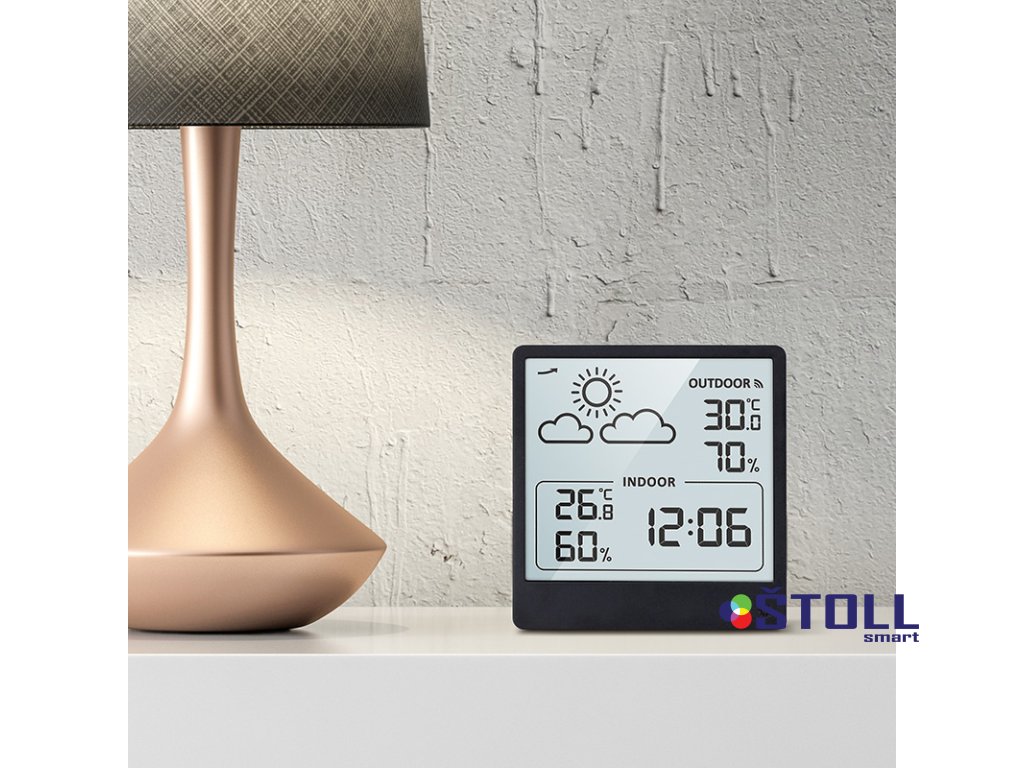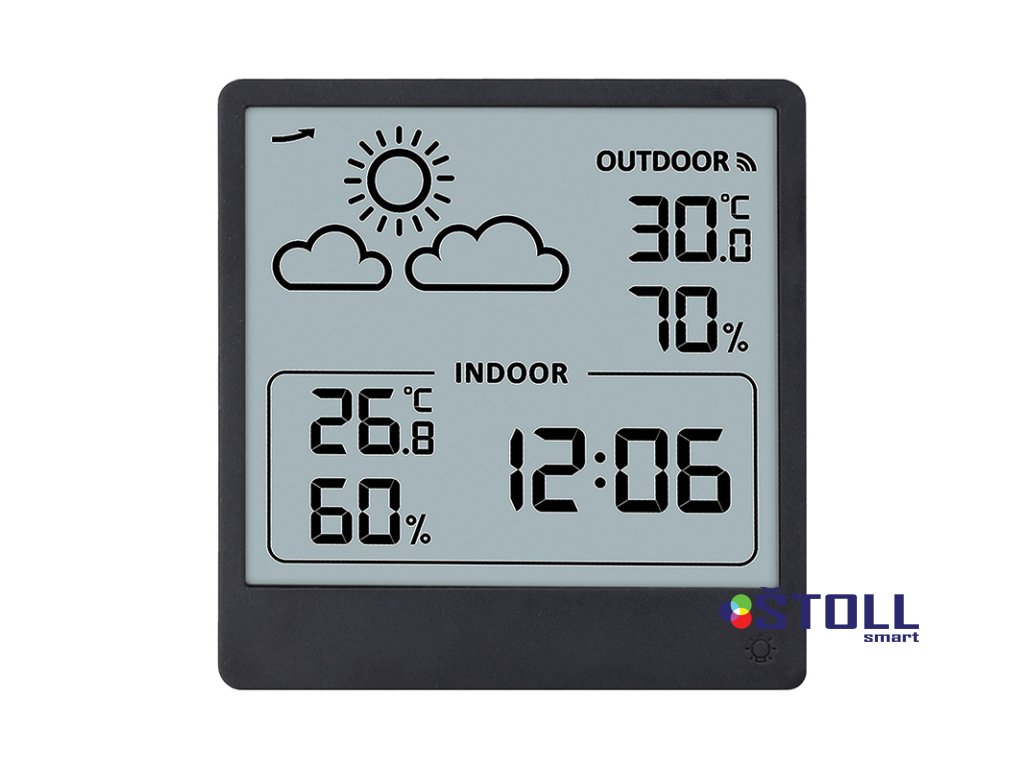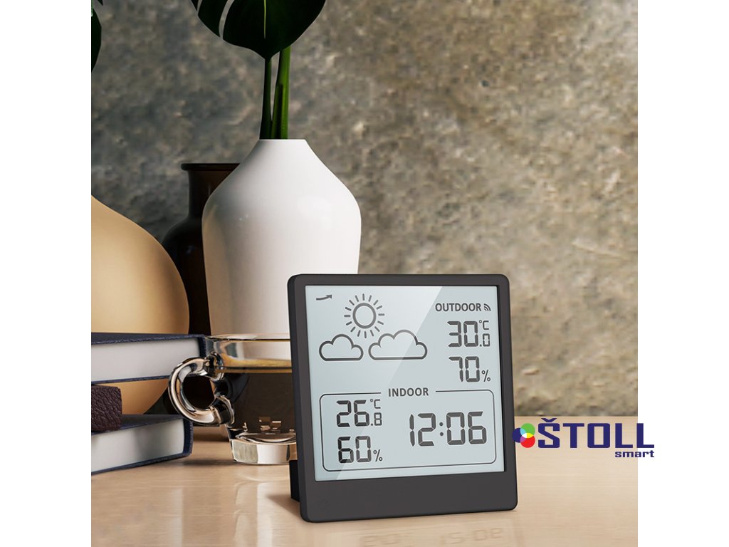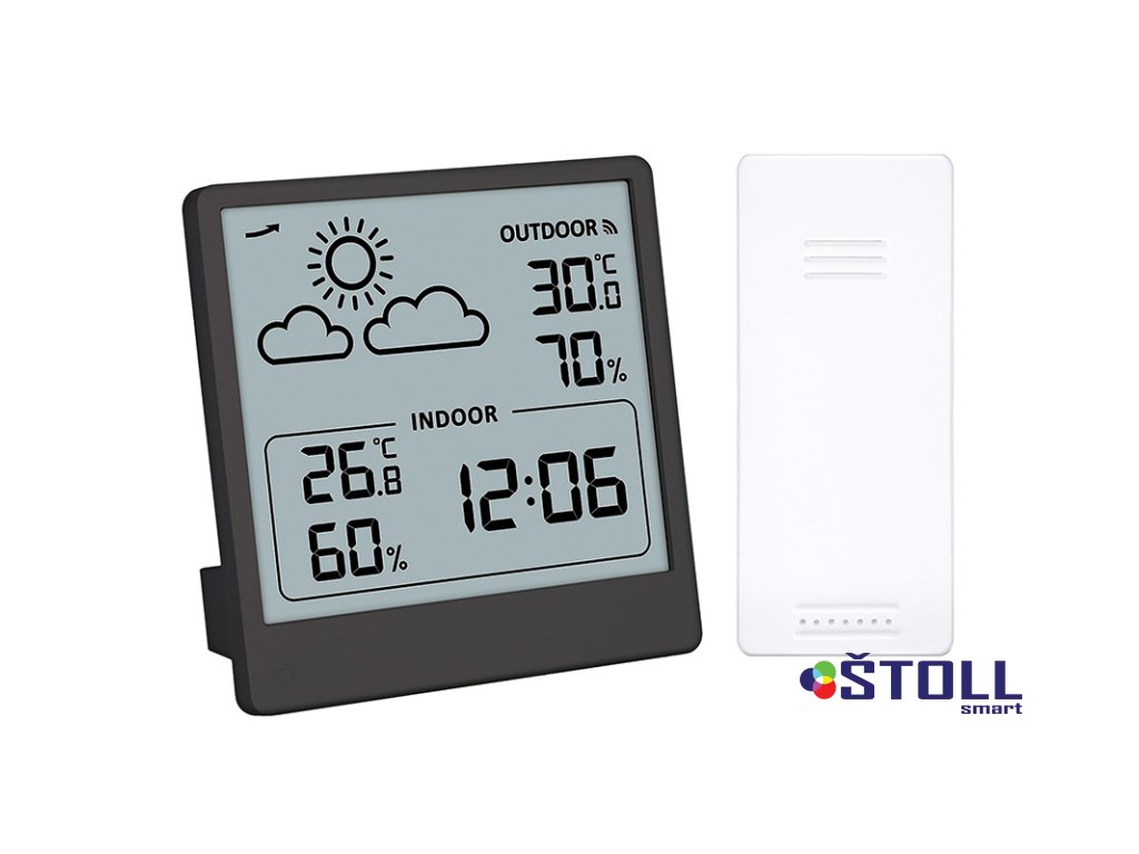 Meteorologická stanice s displejem pro zobrazení času ve formátu 12/24 hodin. Měření vnitřní teploty od -9,9°C do +50°C a venkovní teploty od -40°C do +70°C. Měření vlhkosti (20% až 95%) pro vnitřní i venkovní prostředí. Ukládání maximálních a minimálních hodnot teploty a vlhkosti, zobrazení trendu změny tlaku a předpověď počasí na základě změn tlaku. Možnost volby jednotek teploty °C/°F. Napájení: hlavní jednotka 2× AAA baterie nebo DC5V / 2A, senzor 2× AAA baterie (není součástí balení). Barva: černá.